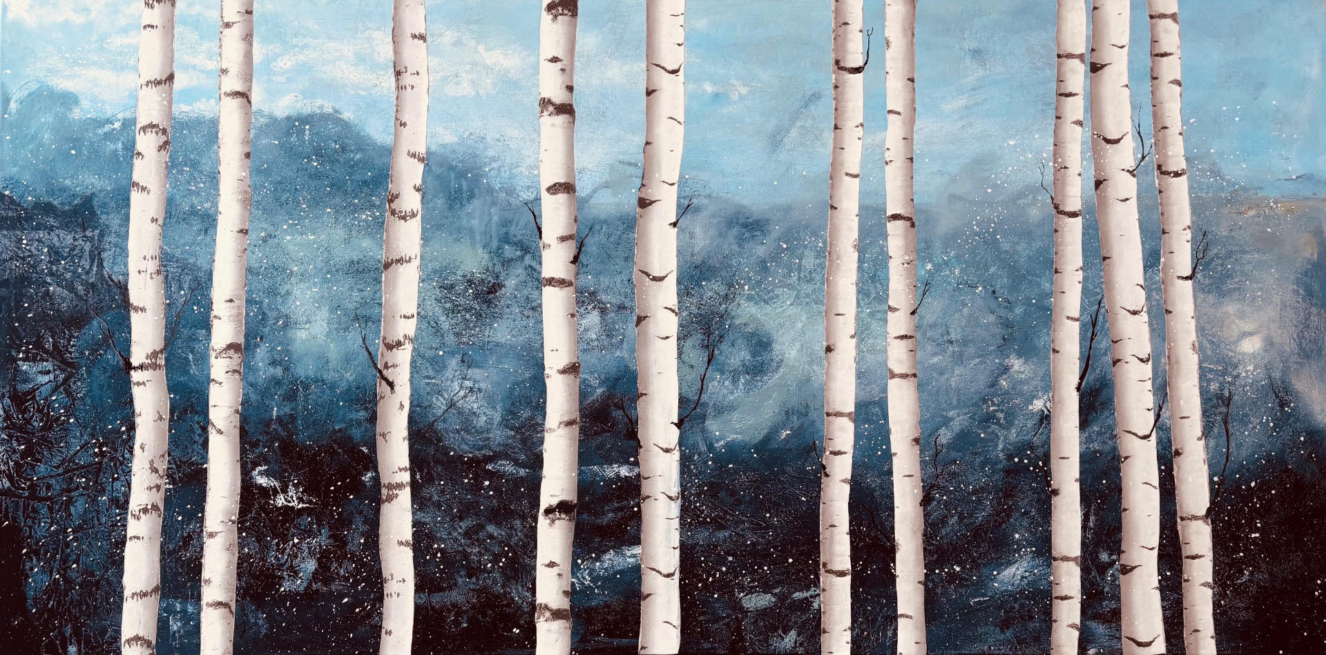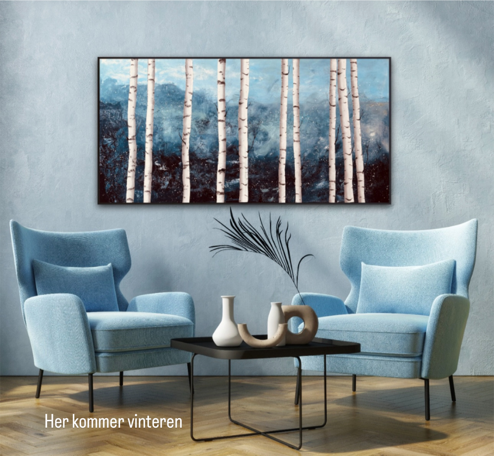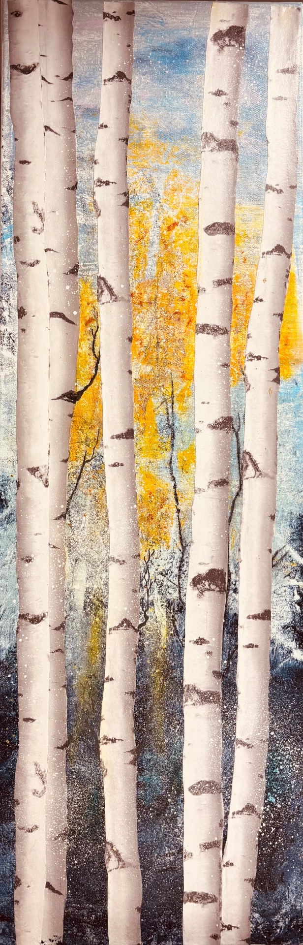 Jeg ble inspirert av denne nydelige vinteren. Her har jeg brukt ulike teknikker. Pensel, papir, svamp, pensel, spray, poscatusj og collage.